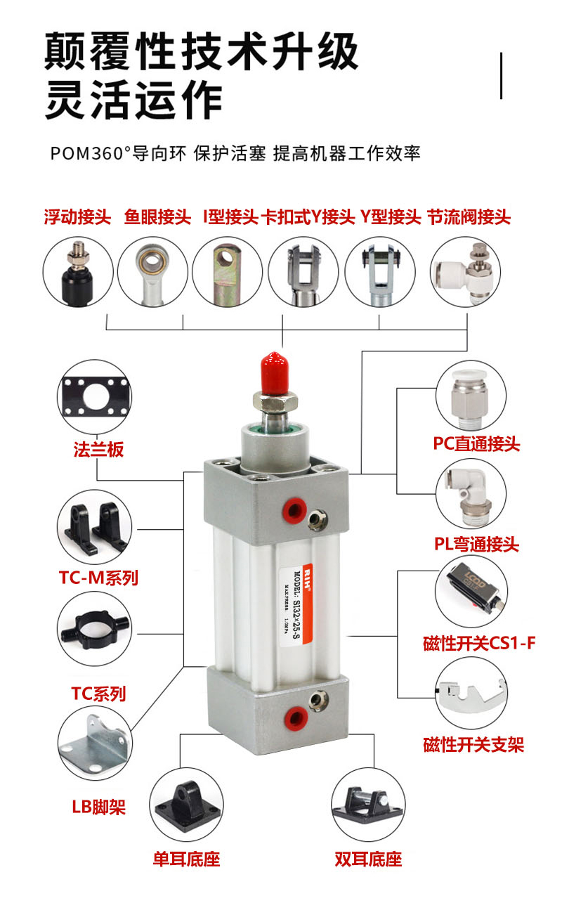 3、多種氣缸安裝附件可供選擇,靈活多變。