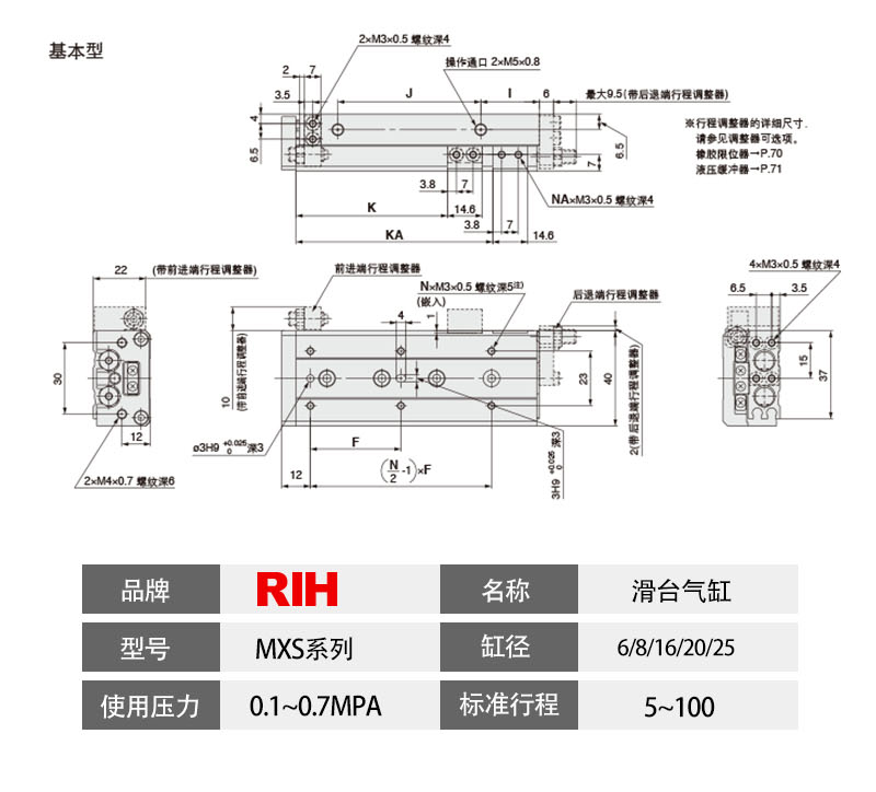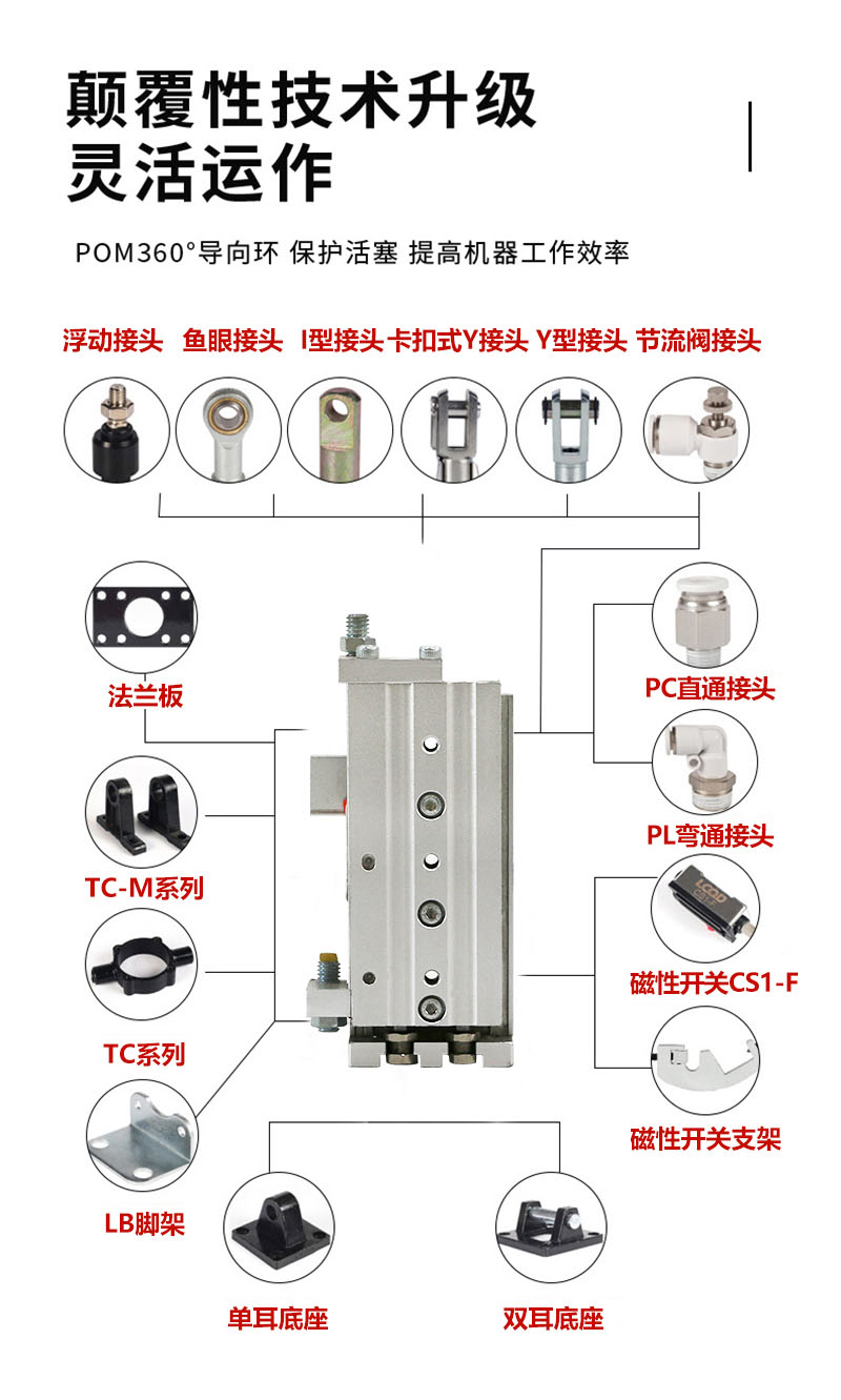 滑臺氣缸多種規格功能可選,帶緩沖器,行程可調。