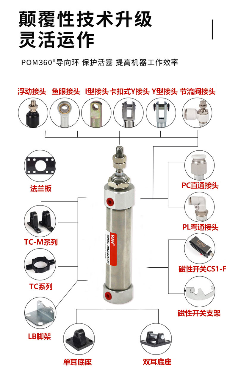 3、多種氣缸安裝附件可供選擇,靈活多變。