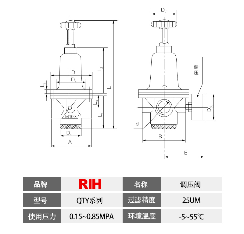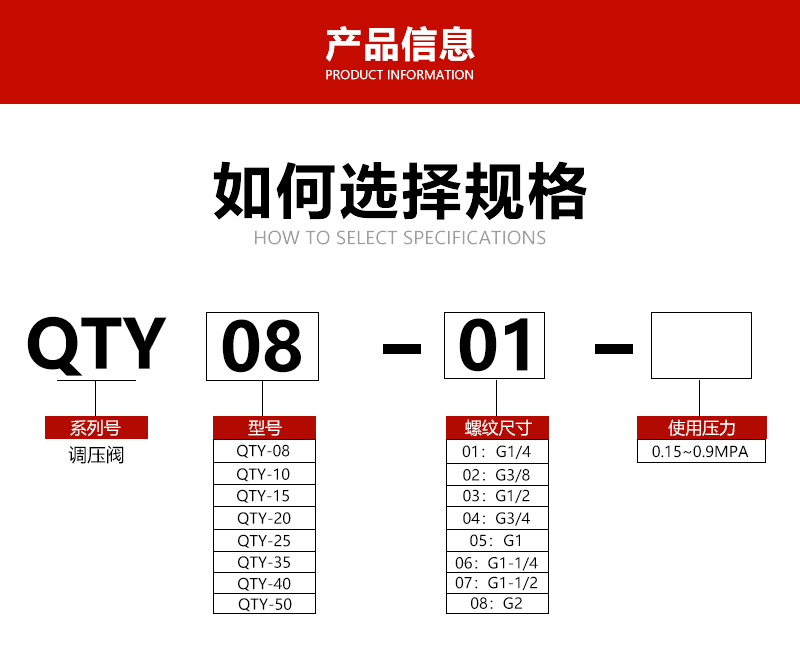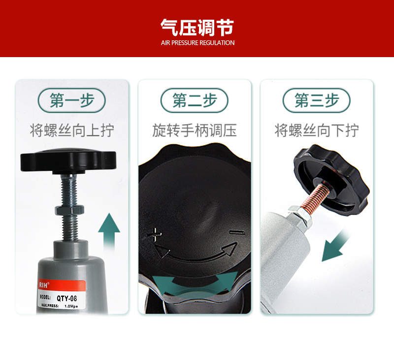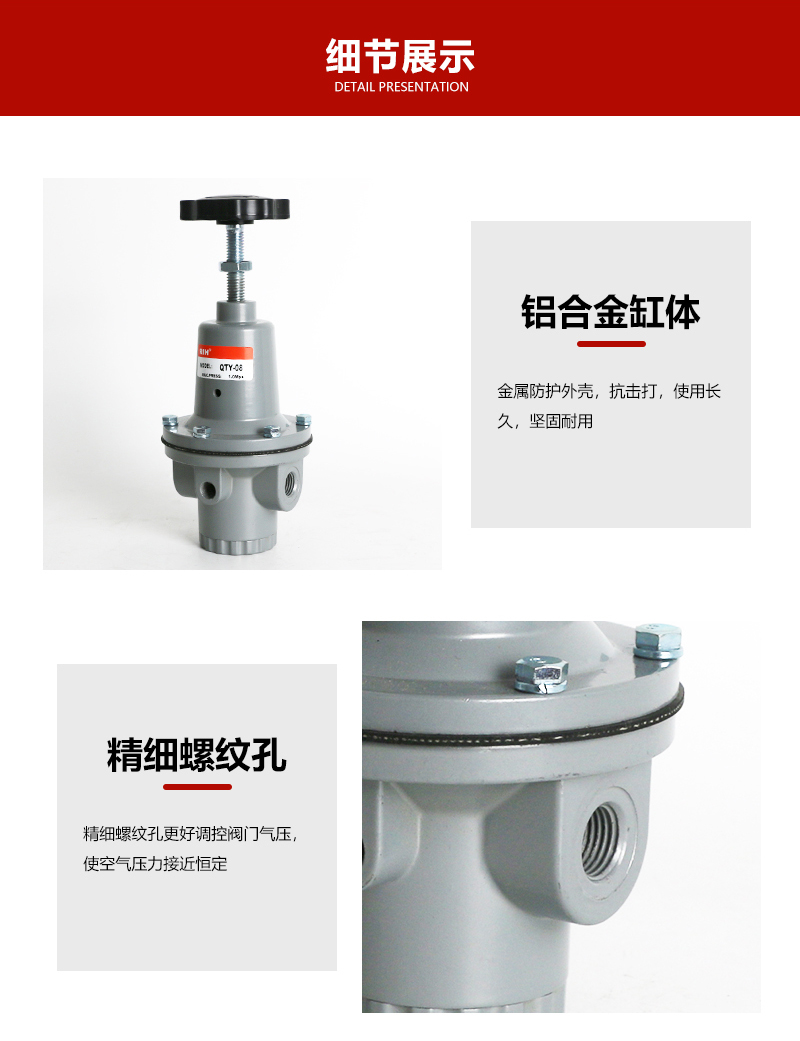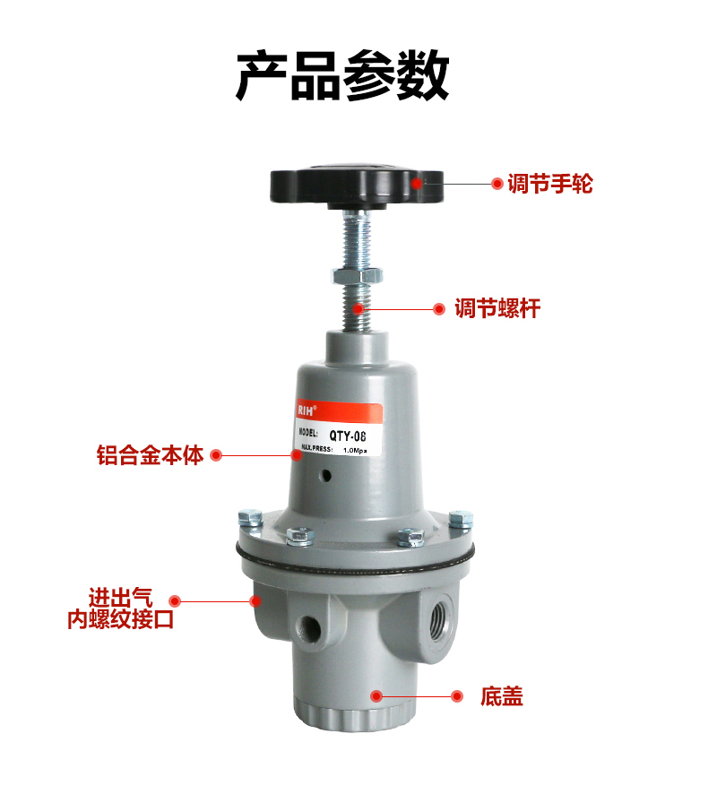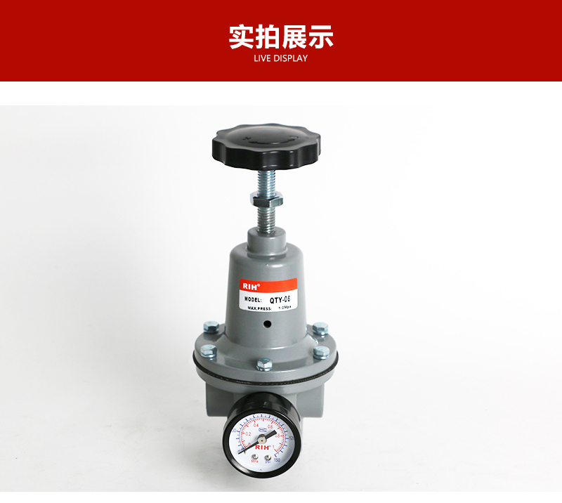 減壓閥是氣動調節閥的一個必備配件,主要作用是將氣源的壓力減壓并穩定到一個定值,以便于調節閥能夠獲得穩定的氣源動力用于調節控制。QTY壓力減壓閥非常適合大口徑的管路調壓,1、為了操作和維護方便,該閥一般直立安裝在水平管道上。2、安裝時應注意使管路中介質的流向與閥休上所示箭頭的方向一致。瑞亨氣動提供最全面QTY空氣減壓閥選型報價及銷售。